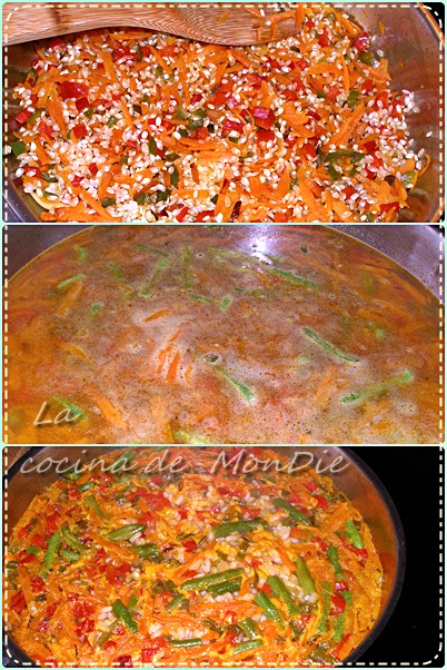 En una cazuela con dos cucharadas de aceite doramos un diente de ajo, cuando tome color se añade la cebolla picada, los pimientos troceados y la zanahoria rallada, ponemos a punto de sal y cocinara fuego medio durante unos diez minutos, añadimos el arroz con las judías verdes y se añade el caldo, dos partes y media de caldo por parte de arroz.