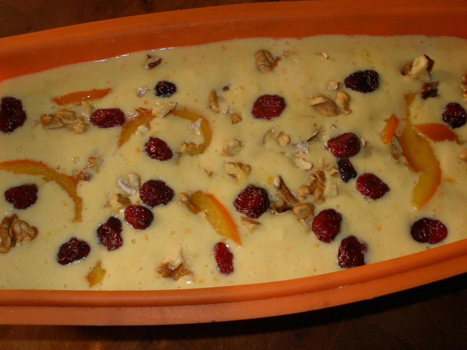 Por encima se ponen las nueces troceadas, arándanos y las pieles de naranja confitada, las pieles son opcionales.