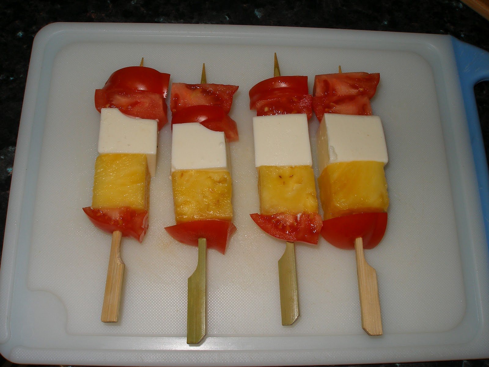 Es importante que cortemos el queso la piña y el tomate en dados del mismo tamaño, empezamos ensartando en las brochetas , primero tomate, luego piña, queso y tomate otra vez, en la plancha a fuego alto hacemos las brochetas medio minuto mas o menos, por cada uno de los cuatro lados.