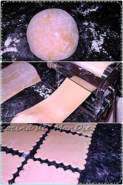 cuando tengamos las planchas de pasta bien estiradas, hacer unos cuadrados con un corta pastas, si no tenéis corta pastas con esa forma lo podéis hacer con un cuchillo o dar otra forma.