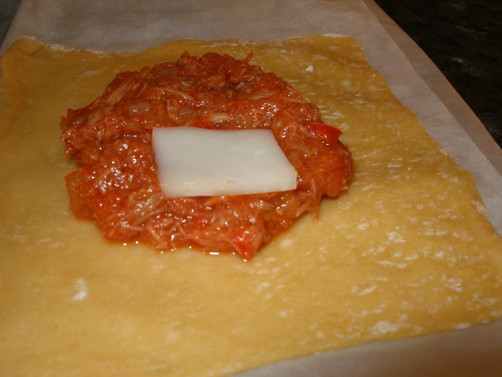 Cortamos en unos cuadrados de unos diez centímetros, ponemos en papel de horno de uno en uno, reservar tapados para que no se nos reseque mucho antes de rellenarlos.