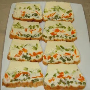 Acomodamos dos rodajas de queso y encima dos rodajas de aceitunas.