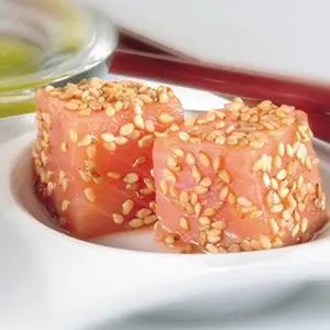 Colocamos el salmón dorado y vertemos la vinagreta por encima y mezclamos.