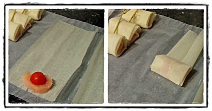 Cortamos la pechuga en medallones de un centímetro mas o menos, ponemos a punto de sal, cortamos los cherrys por la mitad, ponemos un trozo de pechuga en un extremo de la pasta brick, medio cherry encima y envolvemos formando un paquete, ensartamos un palillo para que no se deshaga.