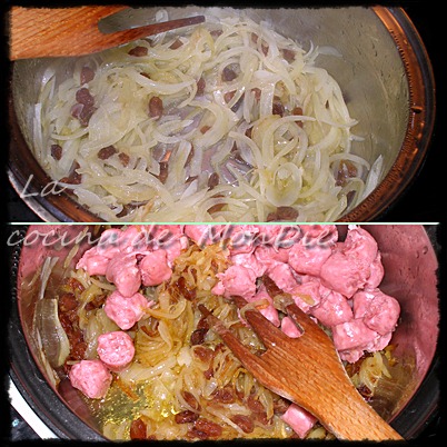 Cortamos en juliana la cebolla , en una cazuela con cuatro cucharadas de aceite la doramos con las pasas  a fuego medio y ponemos a punto de sal.