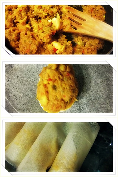 Las hojas de filo las cortamos a la mitad y envolvemos los huevos rellenos con ella, colocamos en una fuente y pulverizamos con aceite o se pintan con una brocha, en el horno con el grill se hacen en cinco minutos, no le quitéis ojo por que realmente se hacen muy rápido.