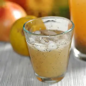 Ponga un cuarto de taza de hielo troceado en cada vaso y cubrimos con el Jugo.