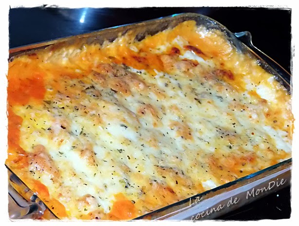 Comenzamos a montar la lasagna, en una rustidera cubrimos el fondo con unas laminas de berenjena, encima ponemos una capa de la mezcla de carne y verdura, un cm. mas o menos, de nuevo otra capa de berenjena cubriendo la carne, y cubrimos de nuevo con la mezcla, a esta capa yo le pongo un poco de tomate frito, mas berenjena y terminamos cubriendo con la bechamel, encima terminamos con queso rallado un poco de orégano y al horno, a 180º 30-35 minutos, dejamos reposar diez minutos antes de servir.