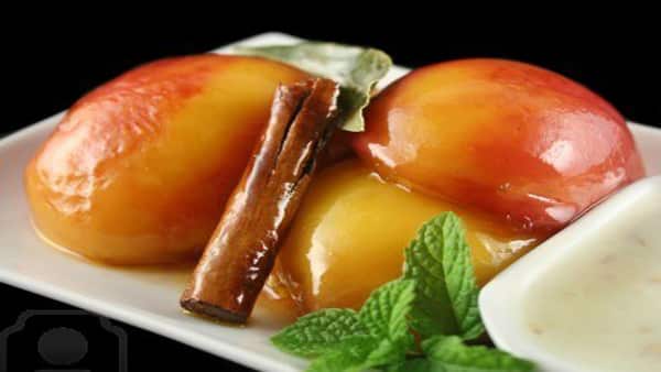 En una bandeja para horno forrada con papel vegetal o encerado colocamos las mitades de los melocotones con la cara hacia arriba, la piel debajo, bañamos con el almíbar que hemos realizado.