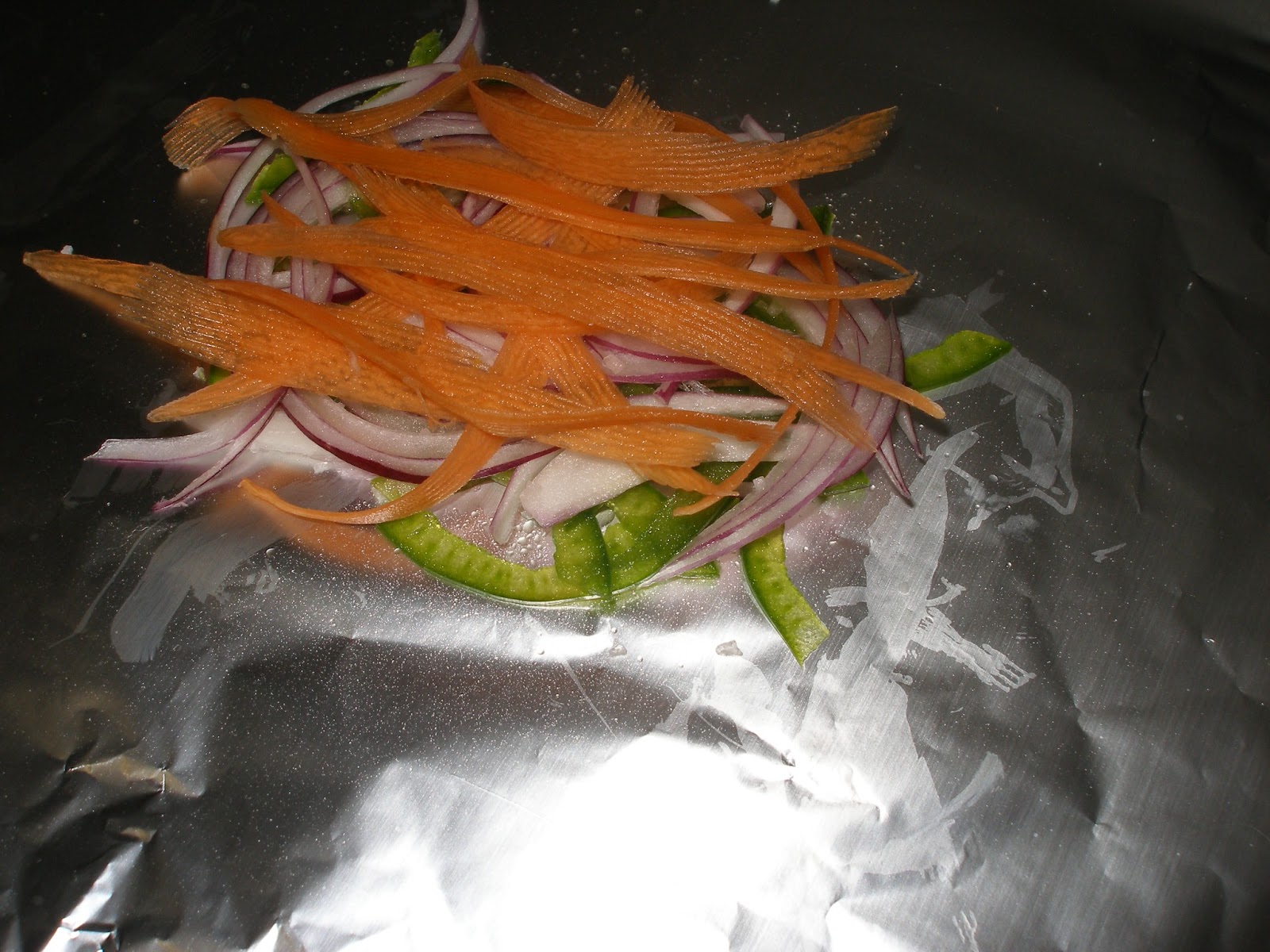 Empezamos preparando la verdura, cortándola en juliana fina , Cortamos un trozo de papel de aluminio bastante amplio, ponemos la verdura en el centro, sazonamos y un chorrito de aceite de oliva , por encima de la verdura se coloca la rodaja de merluza, también con su pizca de sal y su chorrito de aceite.