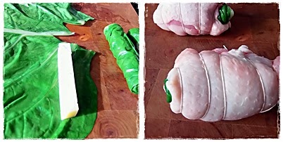 Cortamos el queso en barritas, mas o menos del mismo tamaño que el hueso que hemos quitado, cortamos por la mitad las hojas de acelga y envolvemos el queso con ella, cuando tengamos las cuatro rellenamos el pollo con ellas, una en cada pieza, para terminar bridamos las piezas de carne.