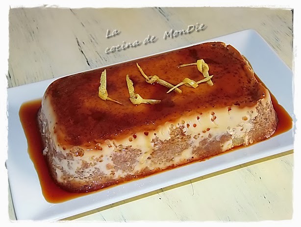 En un molde ponemos el caramelo en el fondo y vamos introduciendo el resto de ingredientes la leche colada, la fruta y los trozos de bizcocho.