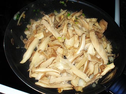 Picamos finamente los ajetes, en la sartén con una o dos cucharadas de aceite se doran ligeramente, picar las setas en juliana e incorporar a los ajetes dorados, cocinar a fuego alto hasta que las setas estén bien doradas y sazonar.