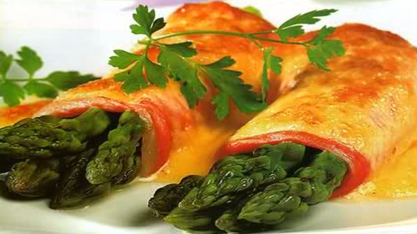 Pelamos las puntas de los espárragos y limpiamos bien. Ponemos a hervir en una olla con abundante agua, dejamos varios minutos con el agua hirviendo, hasta que estén ligeramente tiernos, pero teniendo en cuenta que los volveremos a cocinar ligeramente después.