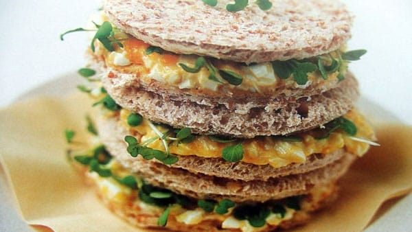 Montamos el Sándwich con una rebanada de pan, el relleno, encima las hojas de berros y volvemos a comenzar con rebanada de pan, hasta colocar 3 capas y terminamos cubriendo con la rebanada de pan y hojas de berros.