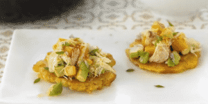 Video receta para hacer tostones con ensalada de cangrejo y aguacate. Una nueva forma de servir un plato típico.